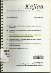 Buku ini mengupas tentang Menjembatani Teori dan Persoalan Masyarakat dalam Perumusan Kebijaksanaan antara lain, Daya Saing dan Prospek Komoditas Pulp dan Kertas Indonesia, Landasan Yuridis Peraturan Perundang-Undangan di Indonesia, Peran Politik Pers diantara Perspektif Stabilitas dan Perkembangan Simultan Kemasyarakatan, Kebijakan Sektor Pariwisata dalam kaitannya dengan Pengembangan Wilayah, Pengentasan Kemiskinan melalui Program Pembangunan Keluarga Sejahtera, dan Fujimori dan Krisis Internal Peru. |